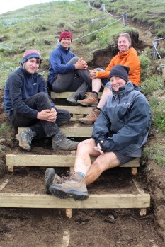 A design using timber-frame steps was chosen because of heavy trail use, steep terrain and the lack of good building stone in the area. The individual timber steps were made at the Langidalur camp and then carried up to the work site dug into the trail and fitted together. They were then filled with stone and earth before being covered with decking boards. The design included spaces between the steps where soil and ryegrass seed was added to encourage re-vegetation to help strengthen the trail and protect from erosion. Next season we will return to Valahnúkur to continue the work.